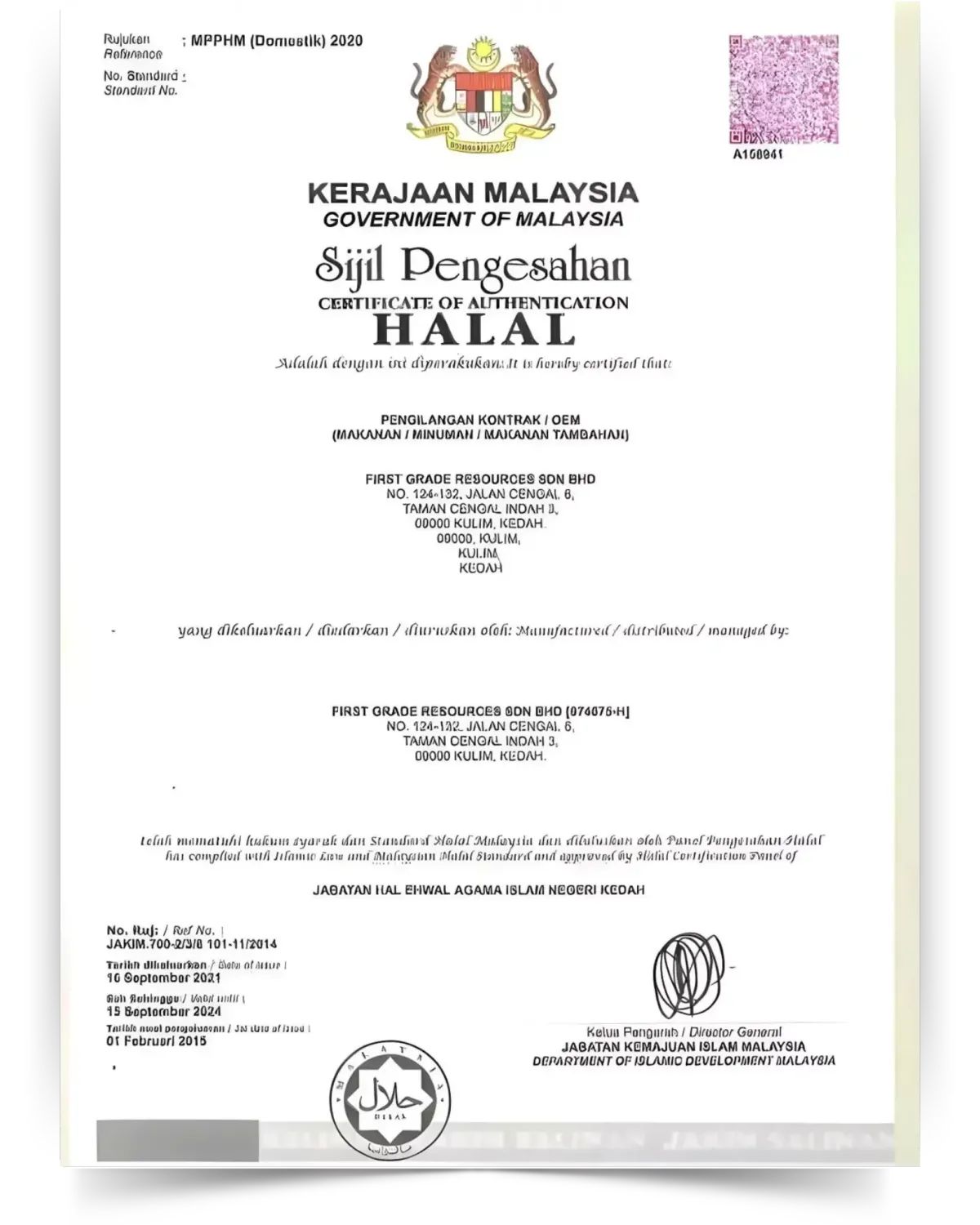 Jakim’s Halal Certification means the product has been certified to meet Halal standards, ensuring that the ingredients, production process, and handling comply with Islamic law. This certification makes the product acceptable to Muslim consumers. It implies that the product does not contain any forbidden (haram) substances and has been processed and handled in ways permissible under Islamic dietary laws.